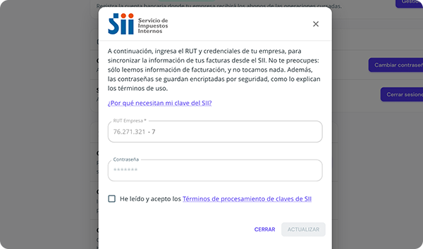 Si ya creaste tu cuenta, ahora solo te falta sincronizar tus credenciales del SII para operar con nosotros. Sincronizarte no te tomará más de 3 minutos.